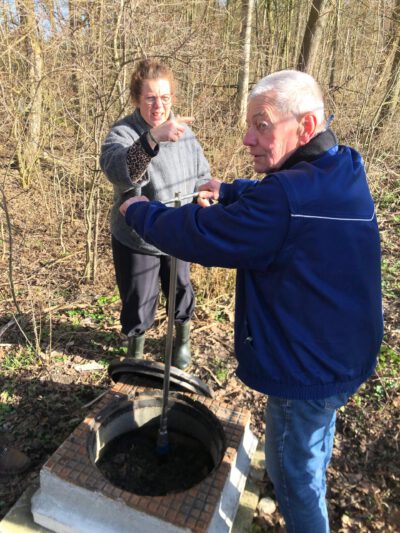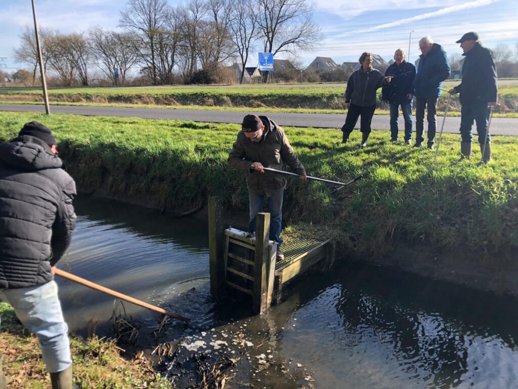 Het is dezer dagen zulk uitgelezen lenteweer dat de ijzologen van IJsklup Sneek 1871 zonder dralen hebben besloten het water nu al van de baan te laten stromen. Daar moeten verschillende handelingen voor worden verricht. Om de afvoer in gang te zetten, draaien de vrijwilligers Klaas de Jong en Jacoline Engelmoer de kraan in de betonnen put tussen baan en het nabije slootje open.