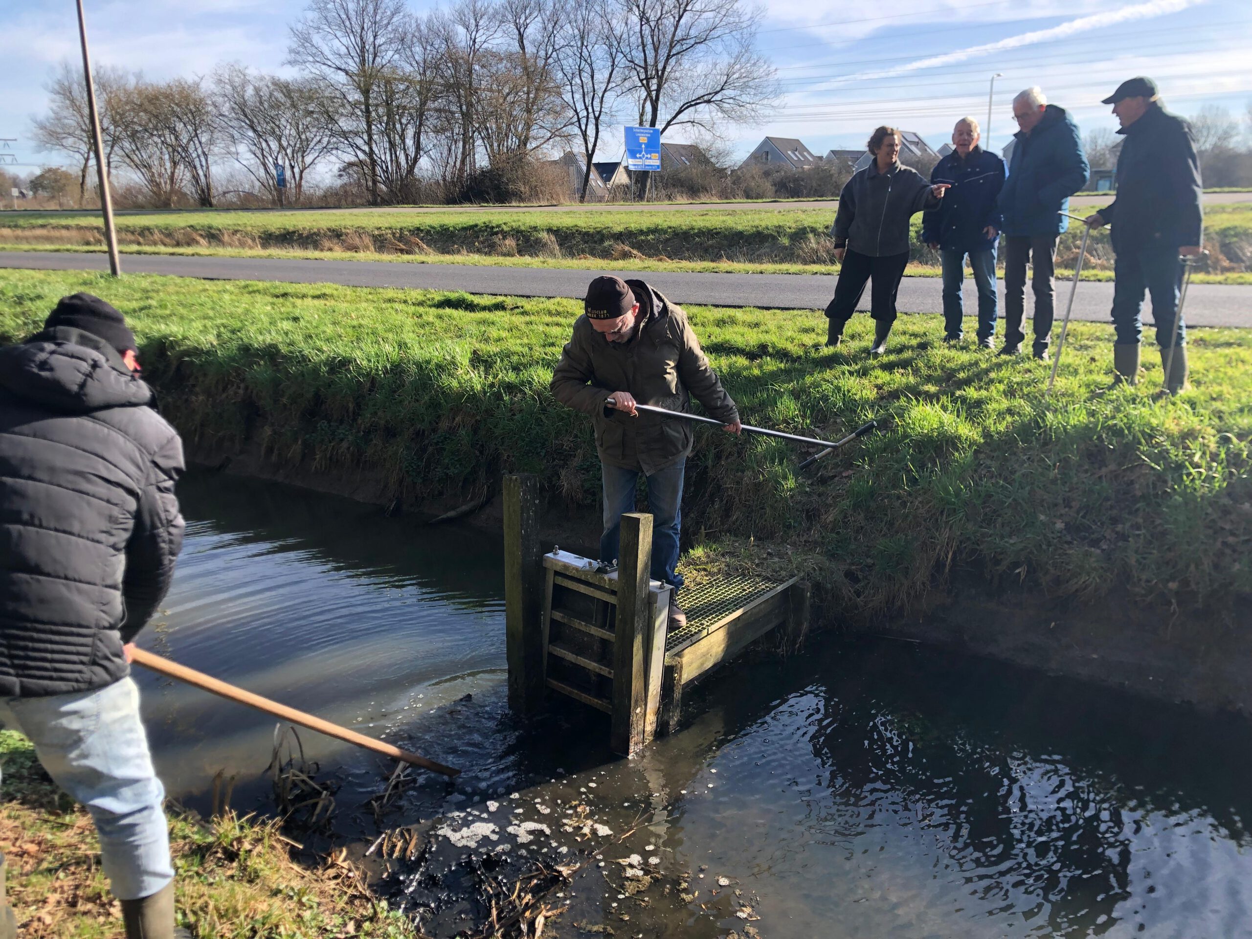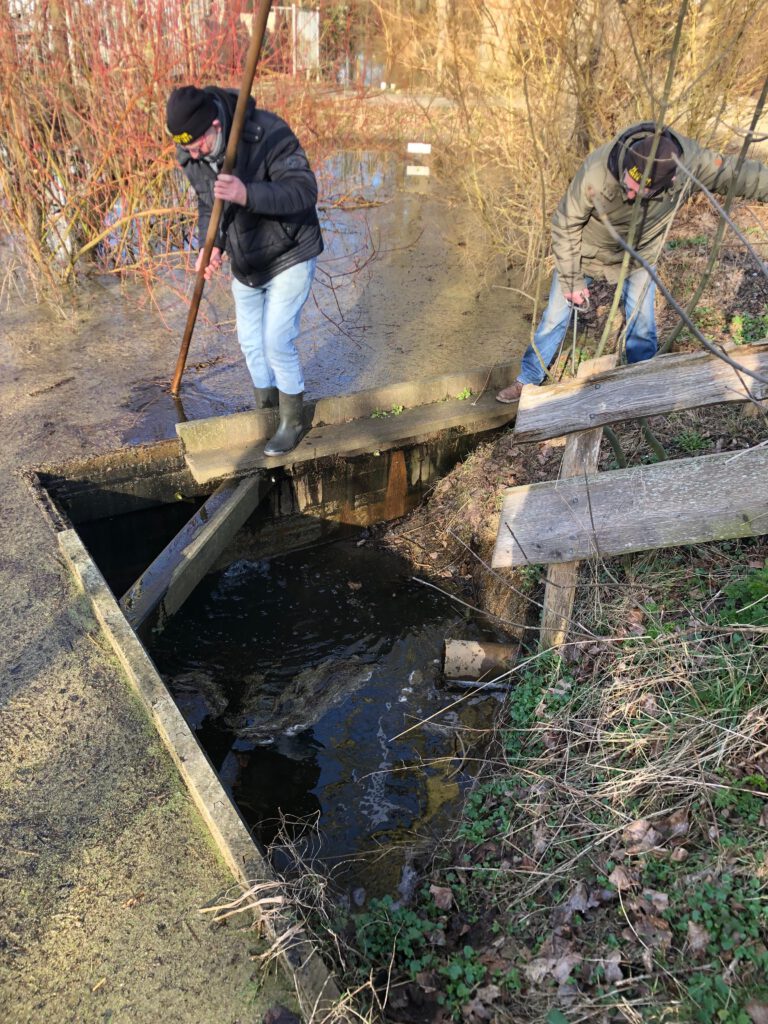 De ijsmeesters Jelle Plantinga, links, en Pé Nota balanceren op een smalle houten dam om met een grote hark vlak boven de bodem de (voor het oog onzichtbare) stalen afsluitschuif omhoog te kunnen trekken. Als dat tenslotte lukt, spuit het vrijkomende water met kracht de lager liggende bermsloot in.