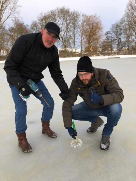 Zo laten betekent voor de korte termijn dat er een niet al te beste sneeuwijsvloer zal ontstaan. Daar is wel op te schaatsen, maar lekker glijden en zwieren zijn dan moeilijk. Goede raad is duur. De baanvrijwilligers, onder leiding van ijsmeester Jelle Plantinga, hebben na ampele overwegingen besloten een stevige scheut water extra op de baan te doen. Plantinga en Pé Nota kweten zich van die taak. Eerst til je de zware stalen deksel van de diepe waterput. Vervolgens moet je met een supersleutel de kraan in de buis tussen het naastgelegen kanaal De Swette en de lagere ijsbaan opendraaien. Het ijskoude water spuit met behoorlijk wat kracht tegen een speciaal stootbord en verspreidt zich dan steeds verder over het terrein. Na een dag en een nacht is er voldoende water over de ijsakker gestroomd.Volgens lang geldende ijswetten is deze methode trikkie bizniz. ,,It is de fraach oft it nije iis goed fêst friest op de ûnderlaach”, zegt Plantinga. ,,We moatte der mar it bêste fan hoopje. Neat dwaan is ek eins gjin opsje”. Het is duidelijk: de mannen doen hun uiterste best. Maar Moeder Natuur blijft de baas. Die kan zomaar met opnieuw een ‘bats’ sneeuw het aanvriesproces in de war schoppen.Dat zou jammer zijn voor schaatsend Sneek, zowel jong als oud, dat immers supergraag dit wintertje hier op scherp geslepen ijzers een gezellig baantje zou willen trekken. En, zoals bekend: dat kan overdag gratis en voor niets – alleen de koek en zopie kosten geld.In de namiddag en avonduren, als de lichten in de elektriciteitsmasten aangaan, moeten de bezoekers bij de kassa hun beurs trekken. Ben je lid dan mag je zonder te betalen doorlopen en je doorlopers vanaf de bekende houten banken langs de baan onderbinden. Nou, spannend. Wordt vervolgd…