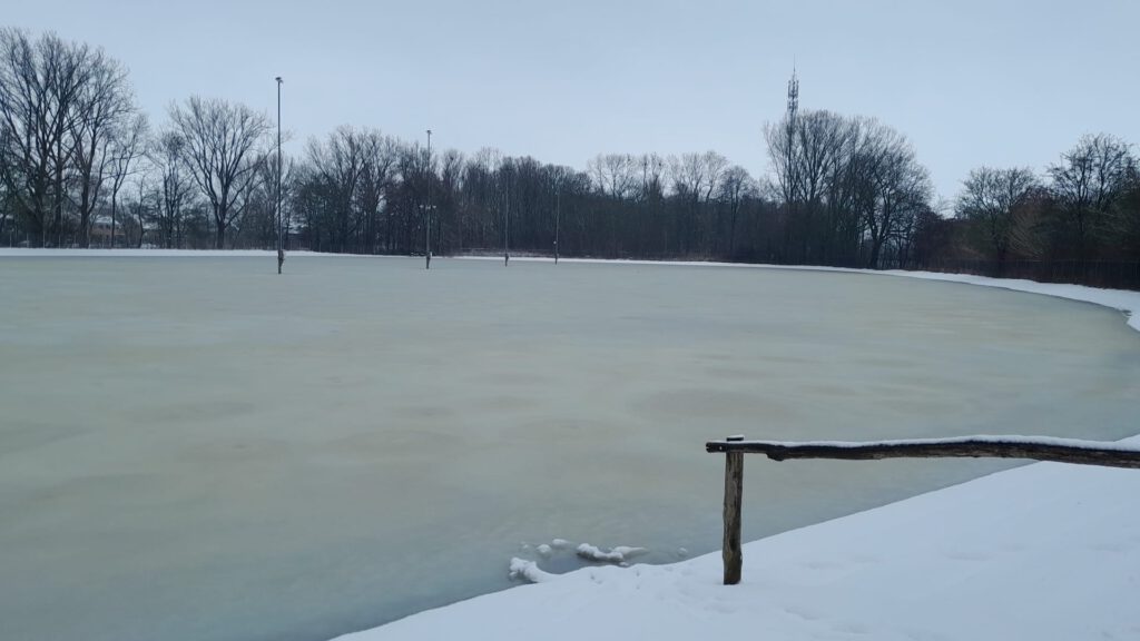 Vlak voor het begin van de jaarvergadering van IJsklup Sneek 1871, woensdagavond 10 december, werd de switch in het gebouw omgezet én – zie daar – baadde de baan vervolgens volop in het licht. Sinds enkele weken biedt het schaatscomplex een heel ander aanzien. Het (kort gemaaide) grasveld is onderwater gezet. Overal staat nu zo’n vijftien centimeter Swettewetter. Dat moet natuurlijk deze winter keihard ijs worden.