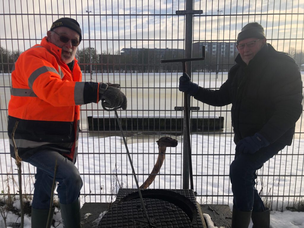De ouwe, getrouwe vrijwilligersploeg van de 154-jarige vereniging heeft deze week het kille boezemwater van het naastgelegen kanaal De Swette op de ruime ijsbaan aan de Leeuwarderweg laten stromen. Vice-voorzitter Klaas de Jong had de vererende taak om de kraan in de dikke aanvoerbuis open te draaien.