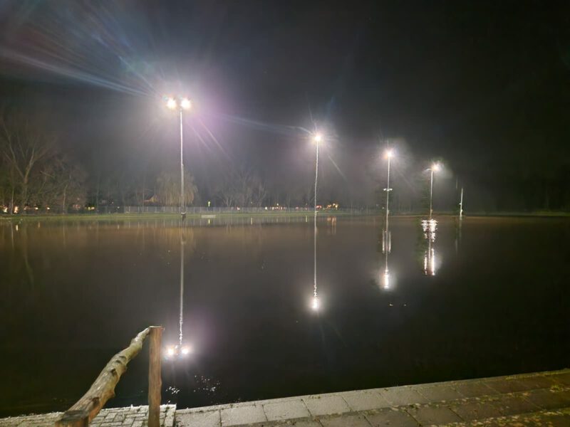 Vlak voor het begin van de jaarvergadering van IJsklup Sneek 1871, woensdagavond 10 december, werd de switch in het gebouw omgezet én – zie daar – baadde de baan vervolgens volop in het licht. Sinds enkele weken biedt het schaatscomplex een heel ander aanzien. Het (kort gemaaide) grasveld is onderwater gezet. Overal staat nu zo’n vijftien centimeter Swettewetter. Dat moet natuurlijk deze winter keihard ijs worden.